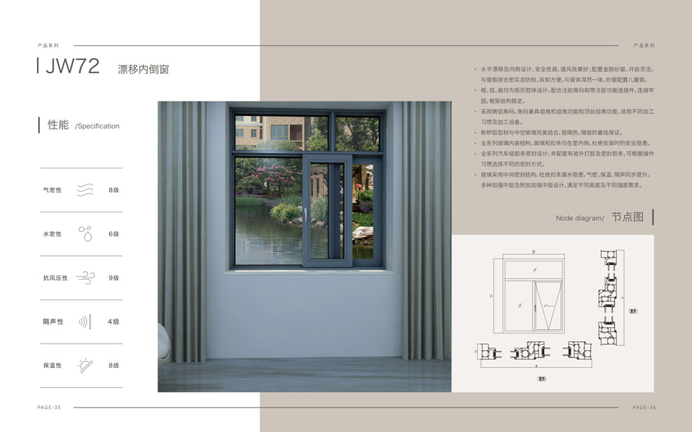 水平漂移及內(nèi)倒設(shè)計(jì),安全性高,通風(fēng)效果好;配置金剛紗窗,開啟靈活,與窗框拼合密實(shí)且防蚊,拆卸方便,與窗體渾然一體,紗窗配置兒童鎖。